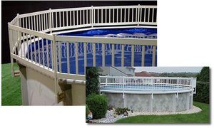 Above-Ground Pool Deck Compatible Fencing 2-Pack Add-On Kit (A). This solid 24" tall fencing helps to safely keep unwanted intruders out of the pool and keep toys and water games in. The rigid vinyl construction is maintenance-free, U.V.-protected, and can be mounted on any above ground pool. Our special mounting brackets are made of high impact resin (so they are super-strong) and they are adjustable to accommodate any width top rail. Installation is easy and our fencing can fit any pool. Backed by a 5-Year Warranty.